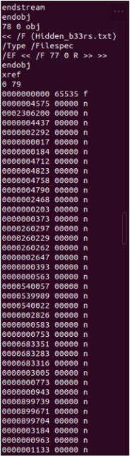 pdf 속에 Hidden_b33rs.txt 파일이 존재하고, 아래에 F 77을 통해 77번 Stream을 참조? 한다고 알 수 있었다. (참조하는 것인지 이동하는 것인지는 잘 모르겠다..!)